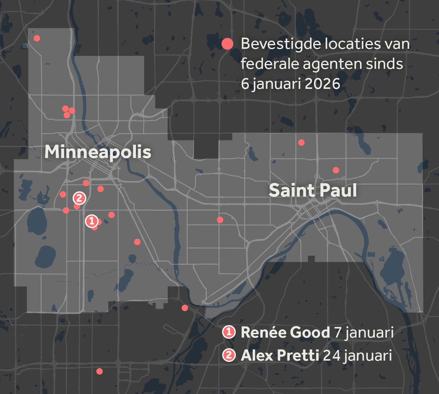 Agenten van ICE en de grenspolitie zijn aanwezig op meerdere plekken in de stad. Hieronder zie je de door nieuwszender CNN geverifieerde locaties. Je ziet ook waar burgers zijn doodgeschoten.