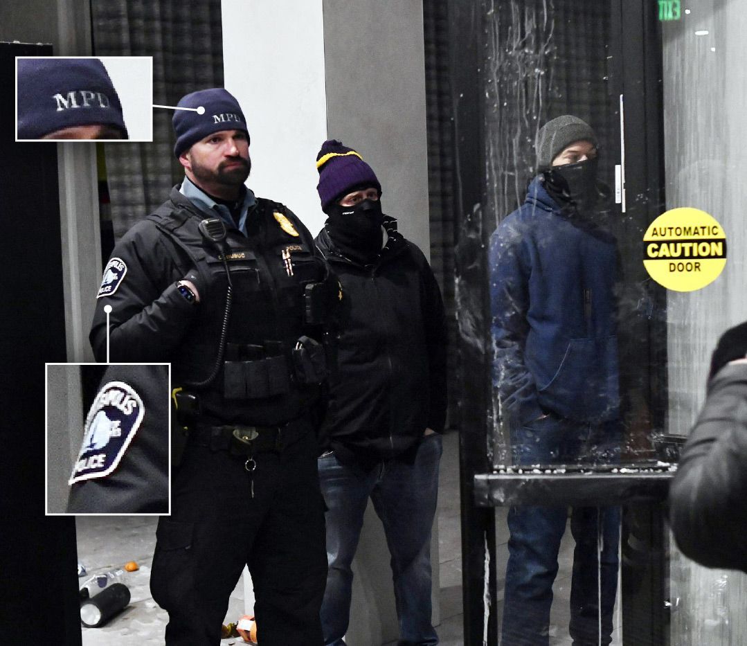 Andersom moet de lokale politie soms ook de ICE-agenten beschermen tijdens protesten. Hieronder zie je agenten van de MPD, de Minneapolis Police Department, een hotel bewaken.
