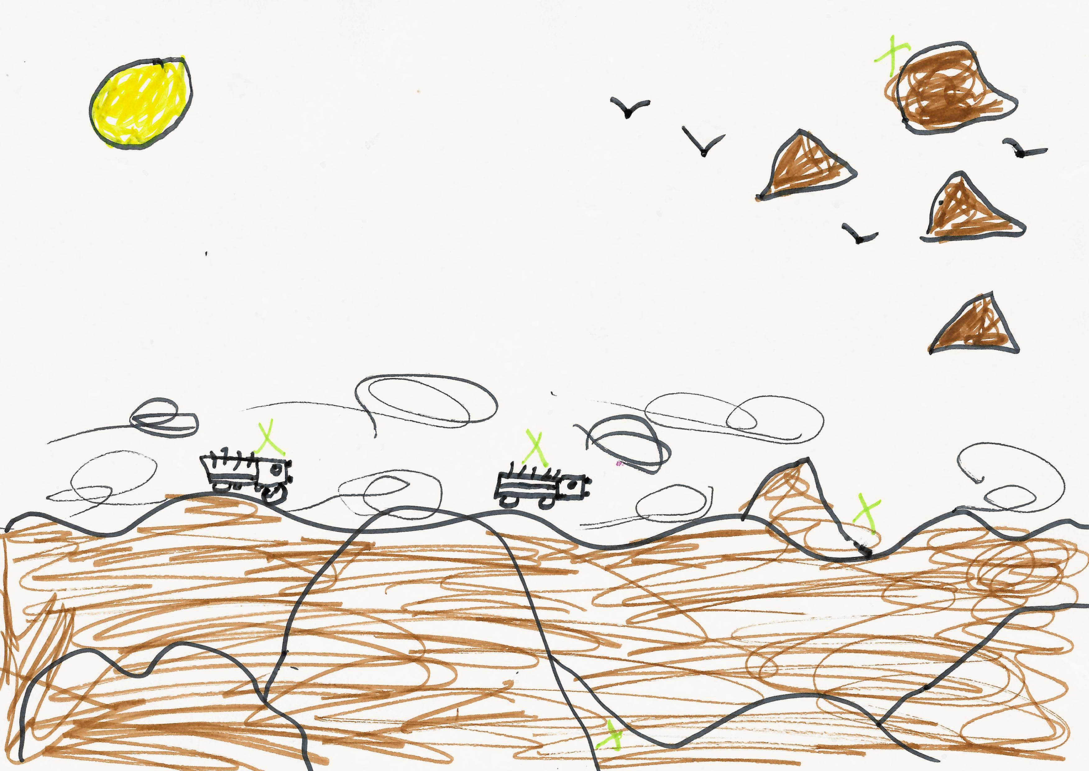 "Ik heb de Piramides van Meroë waar we langs reden getekend. En ook de wolken en de hete zon in de lucht. Ook zie je de Nijl op mijn tekening."