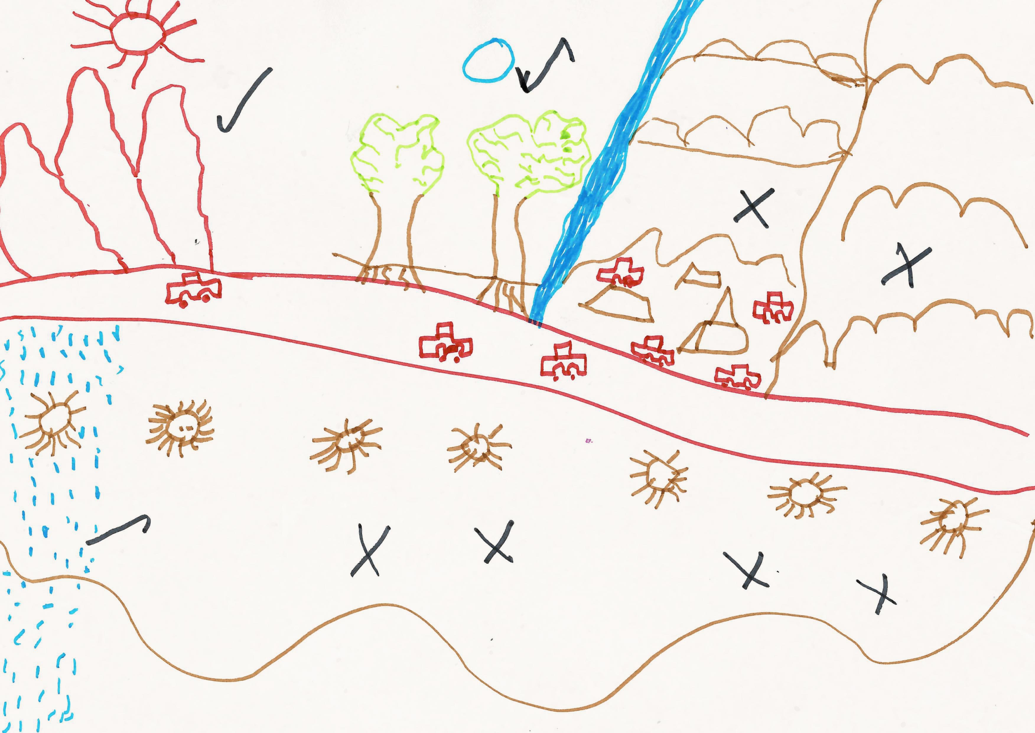 "Deze tekening laat onze reis zien vanaf ons huis in Khartoem naar Aswan, met de bus. De bus waarin we reden was veilig."