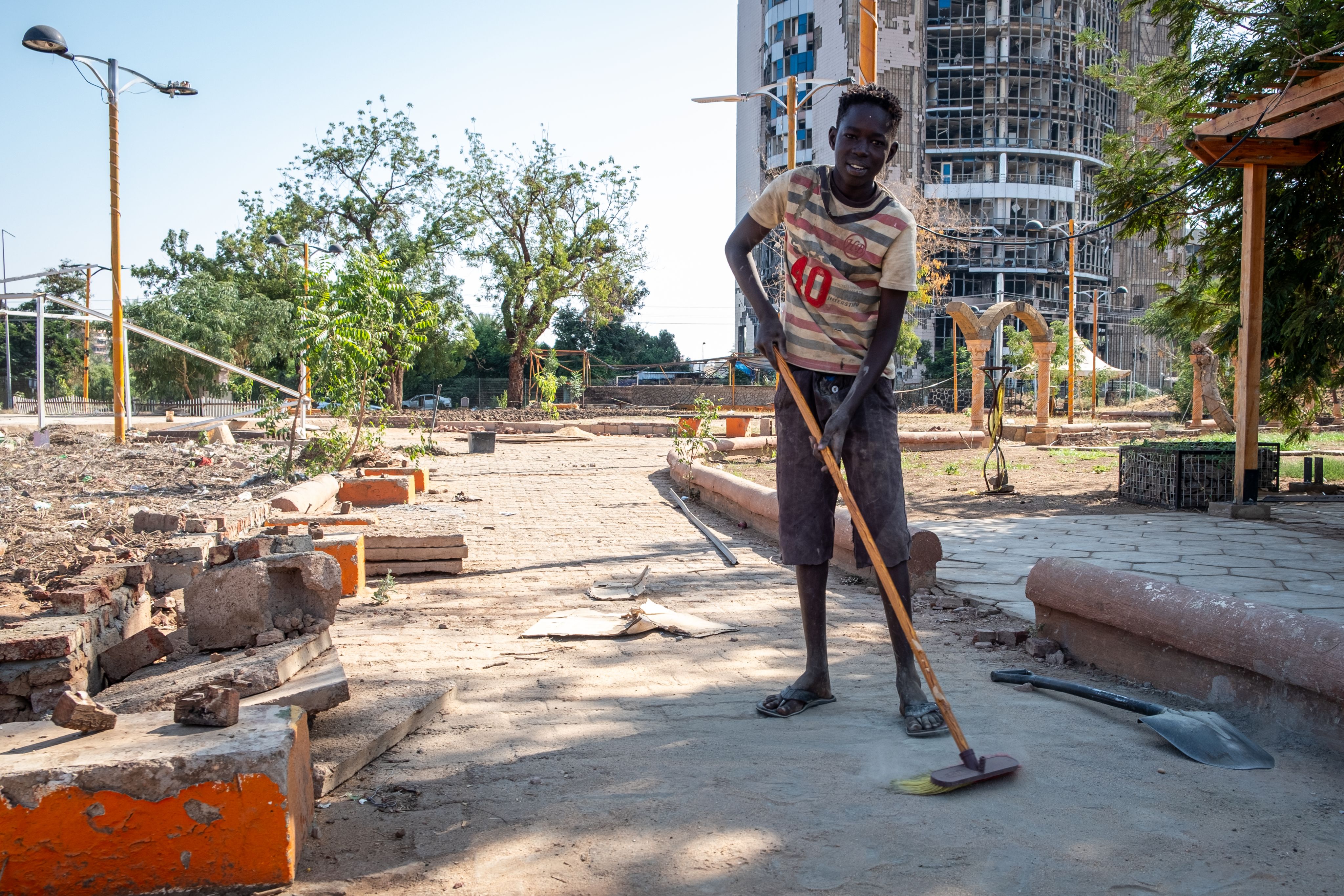 De 14-jarige Mohamed Angalo ruimt puin op in een speeltuin in Khartoem. Foto: Joost Bastmeijer