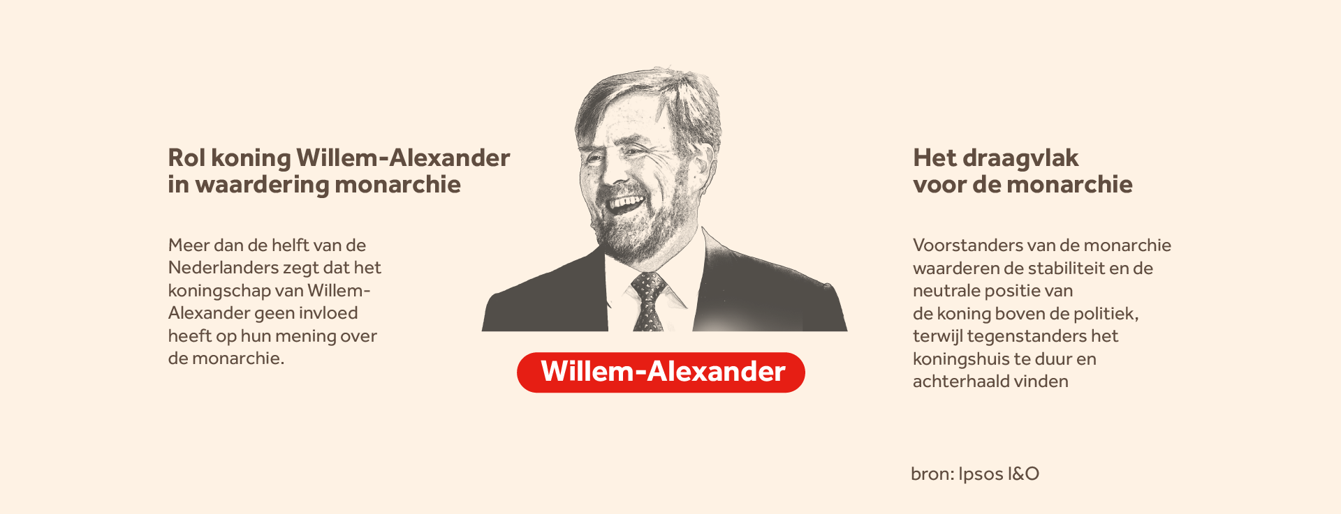 Na vijf jaar is er een duidelijke stijging te zien in het draagvlak voor de monarchie. Dat blijkt uit de NOS Koningsdag-enquête, uitgevoerd door onderzoeksbureau Ipsos I&O. Belangrijk daarvoor lijkt de stabiliteit van het koningshuis en de neutrale positie van de koning in tijden van politieke onrust in de wereld.