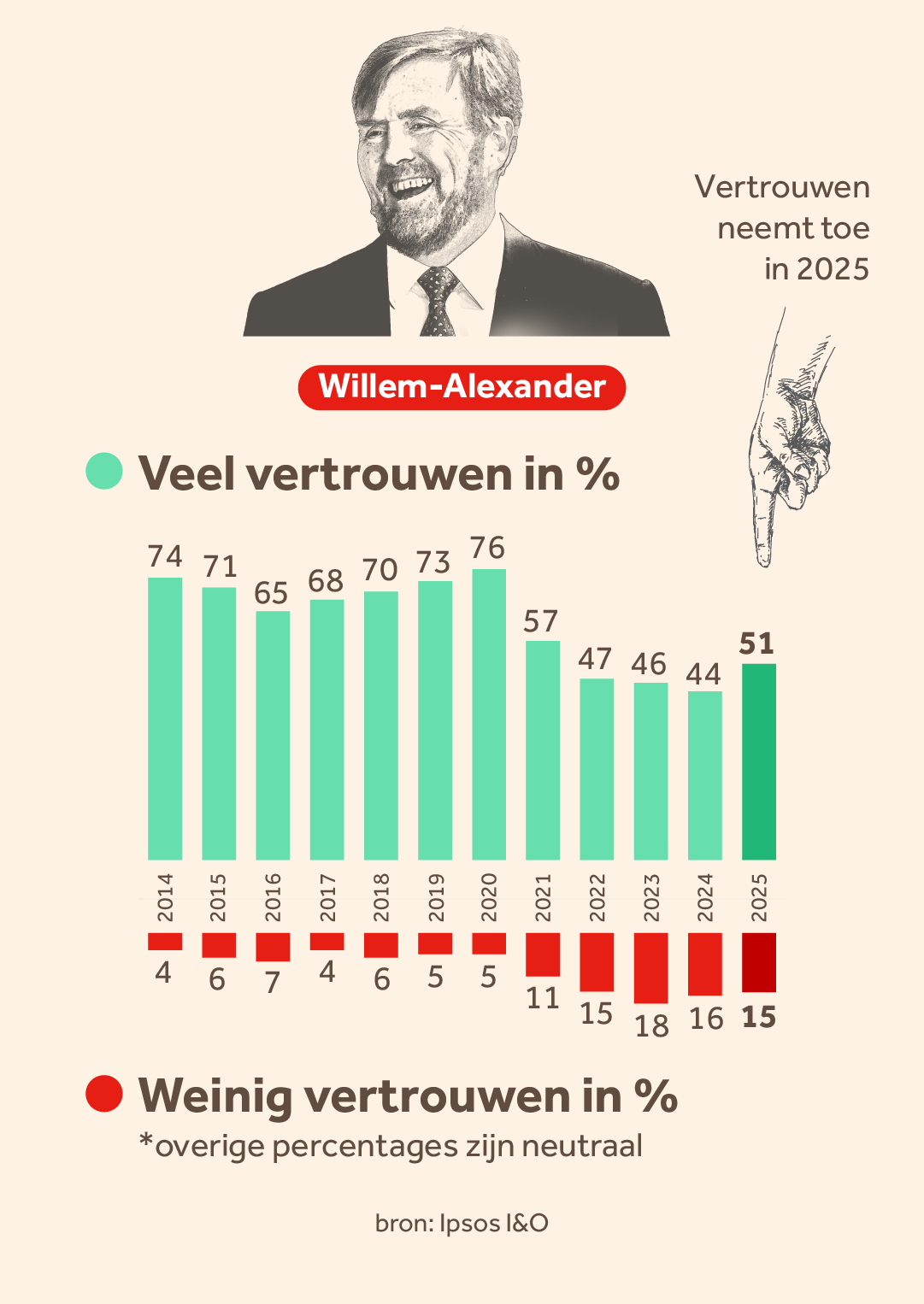 De helft van de Nederlanders zegt vertrouwen te hebben in koning Willem-Alexander. Een aanzienlijke stijging ten opzichte van de afgelopen jaren, toen dat percentage was gedaald tot 44 procent in 2024. Het percentage dat weinig tot geen vertrouwen in hem heeft, is met 15 procent bijna gelijk gebleven.
