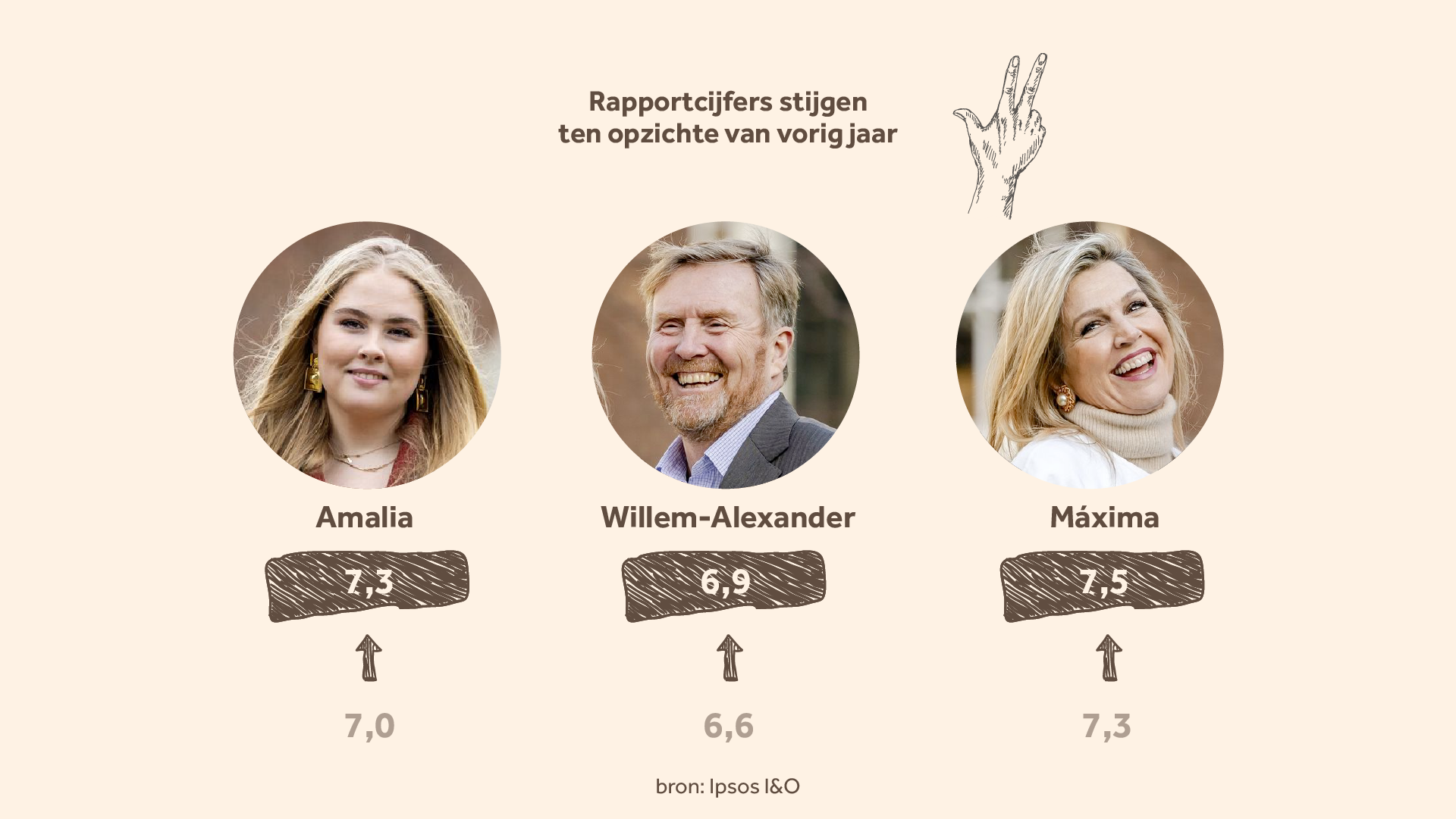 Ook de waardering voor koning Willem-Alexander, koningin Máxima en hun dochter Amalia is gestegen. Ze krijgen dit jaar alle drie een hoger rapportcijfer. De koning is volgens veel Nederlanders gegroeid in zijn rol als verbinder.