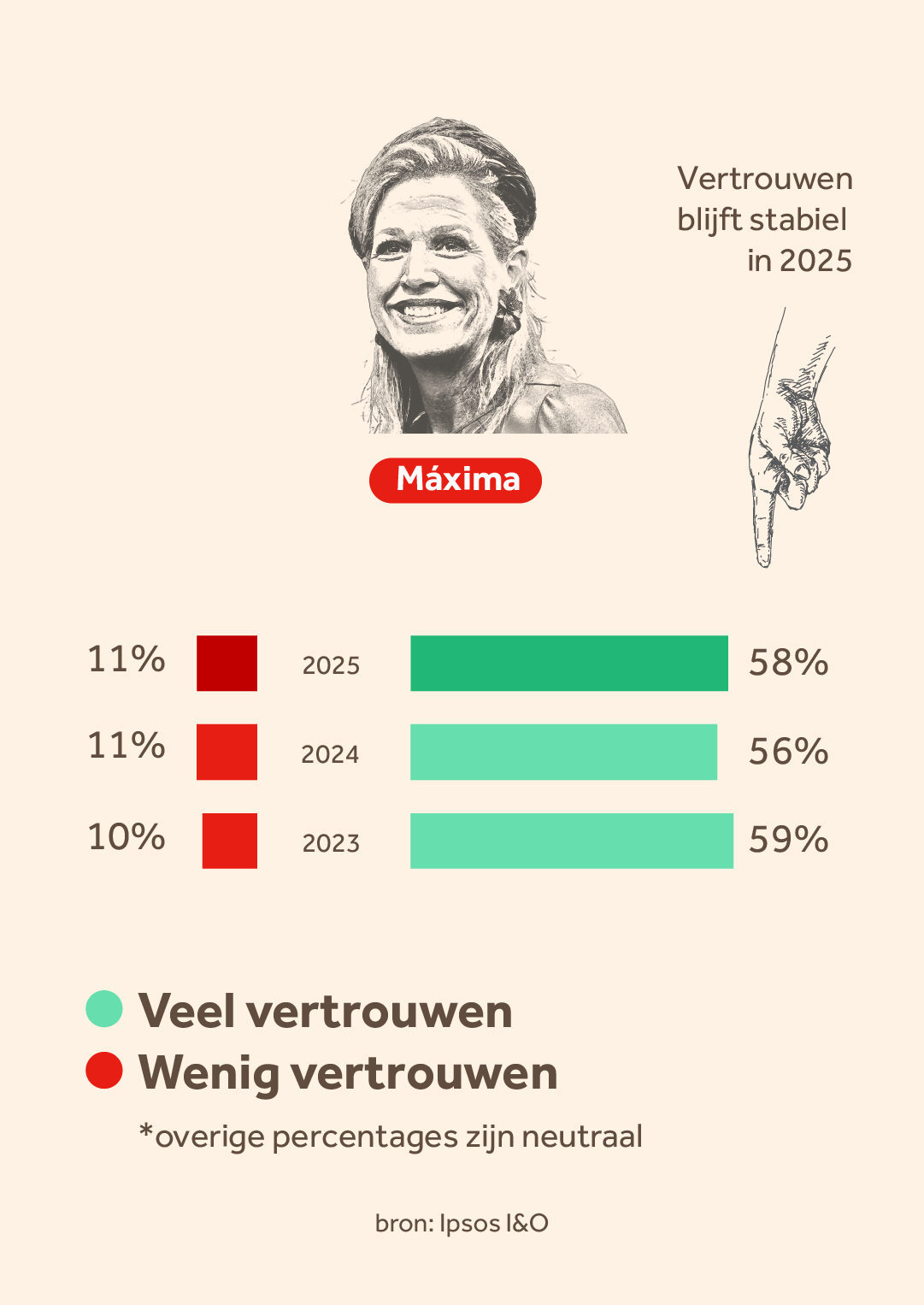 Het vertrouwen in koningin Máxima is de laatste jaren stabiel rond de 58 procent.
