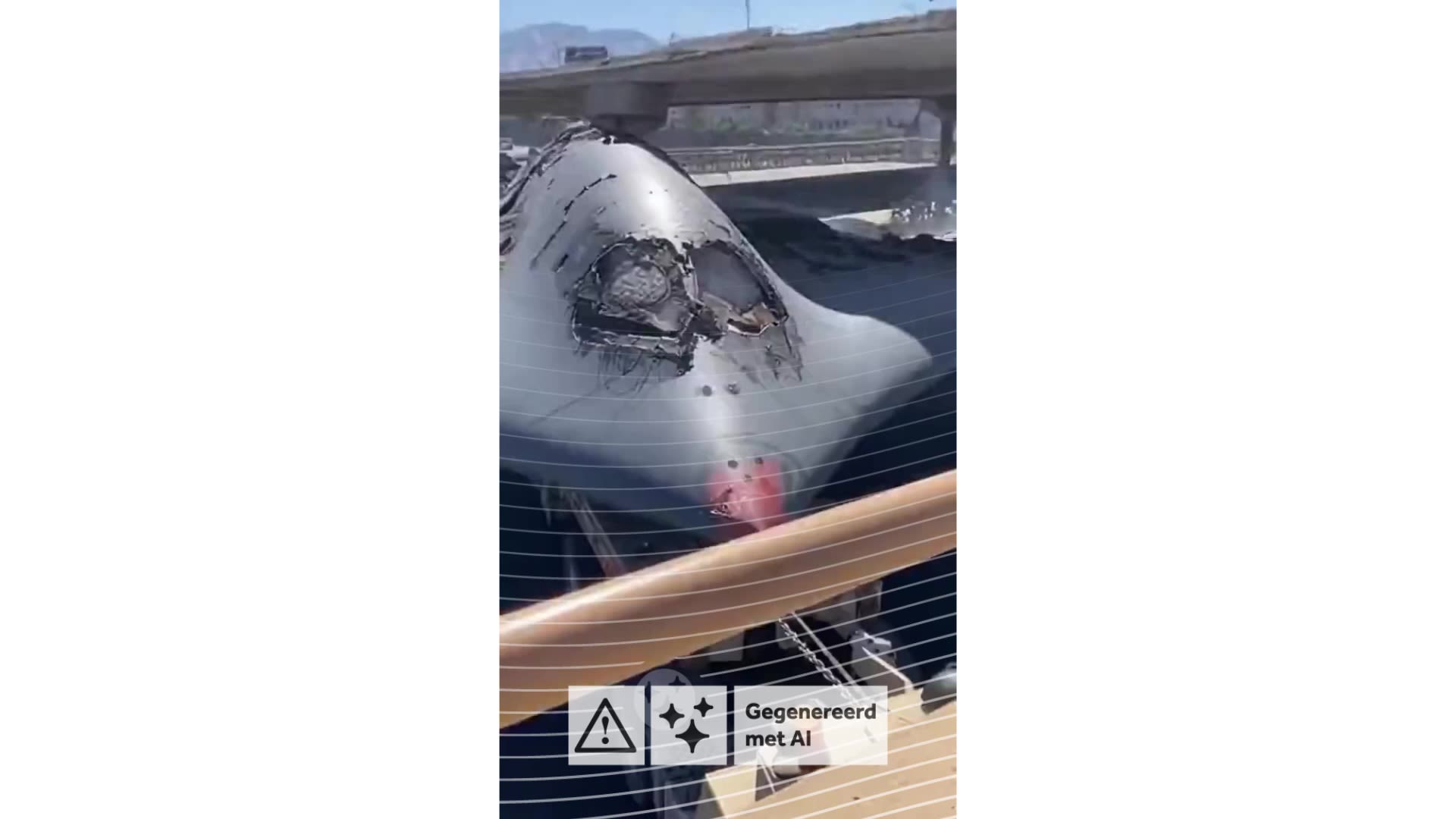 De Vries: "Hier ligt een Amerikaanse bommenwerper op een Iraanse oplegger. Maar als je op de details let, kun je ontdekken dat dit een AI-video is. Zo is bijvoorbeeld ineens een geel vlaggetje te zien dat er daarvoor nog niet was. Bovendien is het vreemd dat de bommenwerper nog altijd rookt. En later in de video verandert de schade aan de neus. Dat is kenmerkend aan veel AI-video's: details zijn vreemd of ontstaan of veranderen plots."