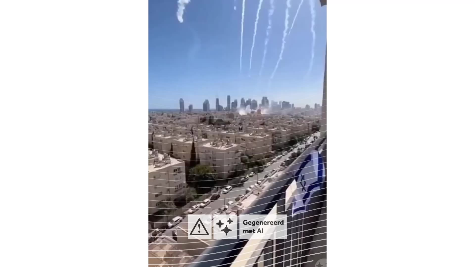 De Vries legt uit: “Dit zou een aanval moeten zijn op Tel Aviv in Israël. Maar je kunt aan meerdere dingen zien dat dit een AI-video is. Bijvoorbeeld aan de kleur van de rook. Een aanval op een oliedepot zorgt bijvoorbeeld voor zwarte wolken, rook van een chemische brand is vaak oranje en een aanval op een luchtverdedigingssysteem geeft over het algemeen witte rook. En dat al deze doelwitten zo dicht op elkaar zitten, in stedelijk gebied, is heel onwaarschijnlijk.”