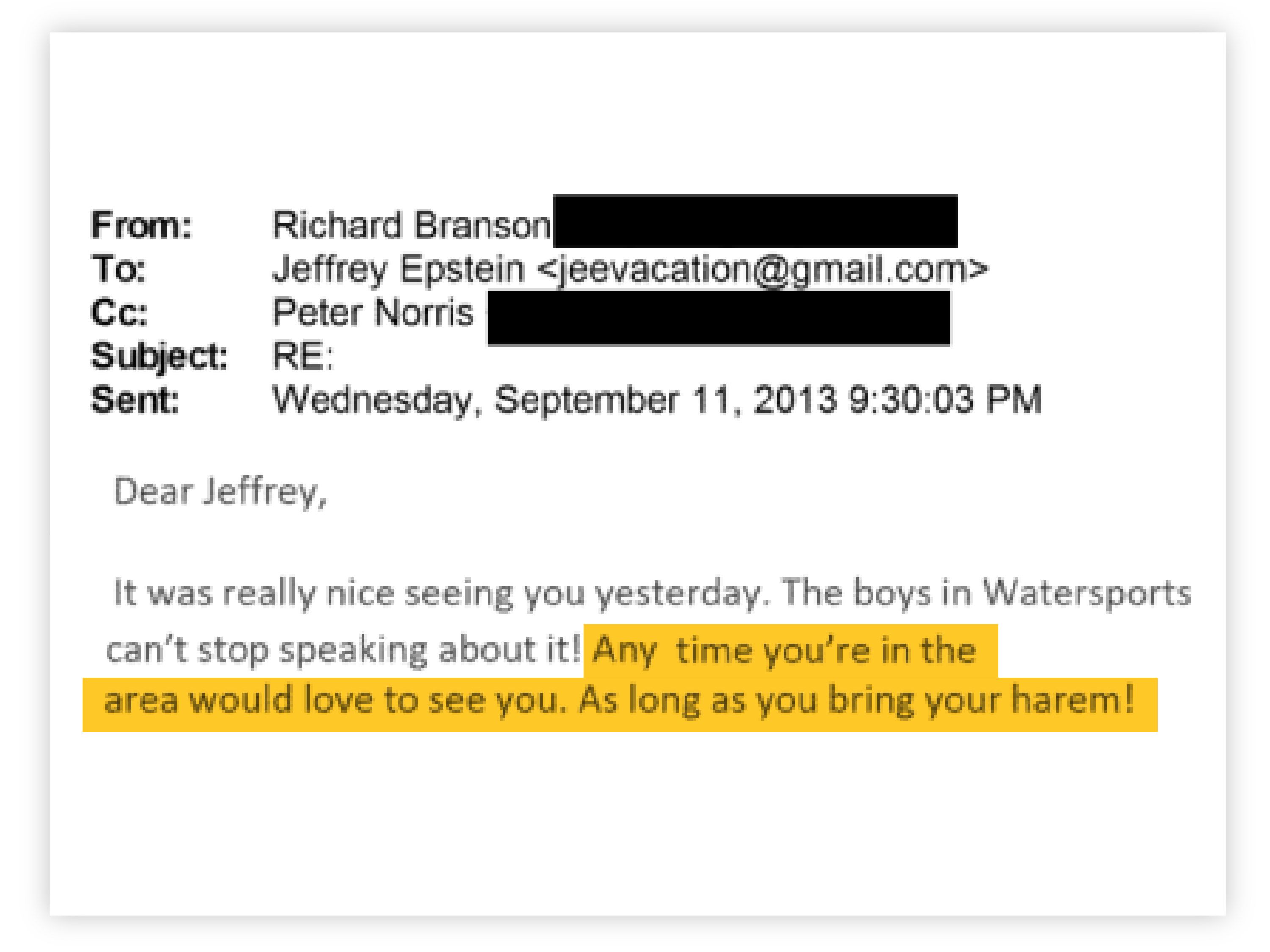 In de mails zijn nog veel meer invloedrijke personen te vinden. Zo mailde Epstein onder meer met Bill Gates en Elon Musk over (mogelijke) bezoekjes aan zijn privé-eiland in de Caraïben. De Britse ondernemer Richard Branson nodigde hem - en zijn 'harem' - weer uit op zijn eigen eiland.