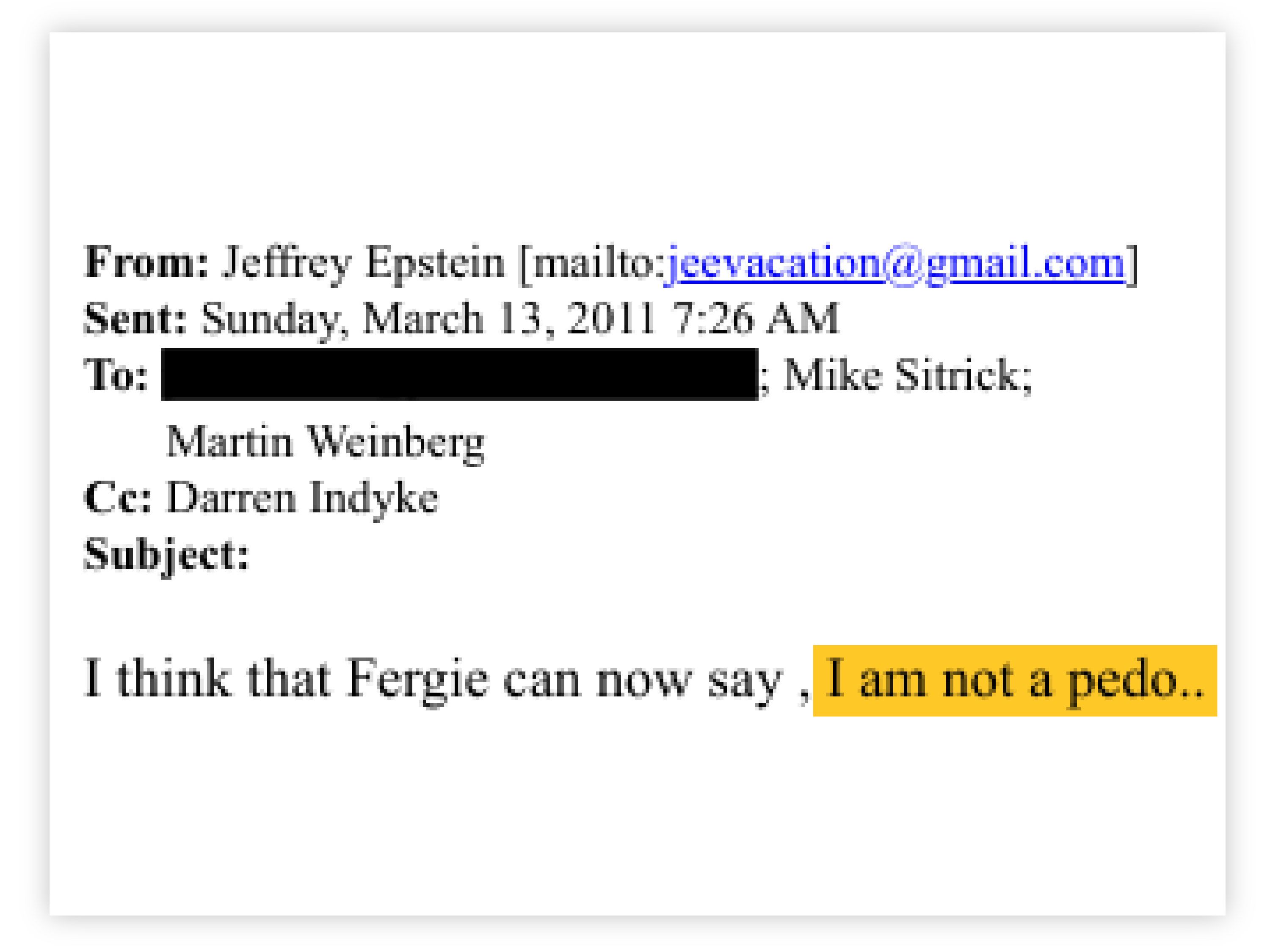 Uit de vrijgegeven mails blijkt dat Epstein ook een goede band had met Andrews ex-vrouw Sarah Ferguson, ook bekend als Fergie. Zij noemt hem onder meer "de broer die ik altijd heb gewild". Als de Amerikaanse zakenman weer negatief in de pers komt, bespreekt Epstein met zijn advocaten plannen om Fergie zijn imago te laten opvijzelen.