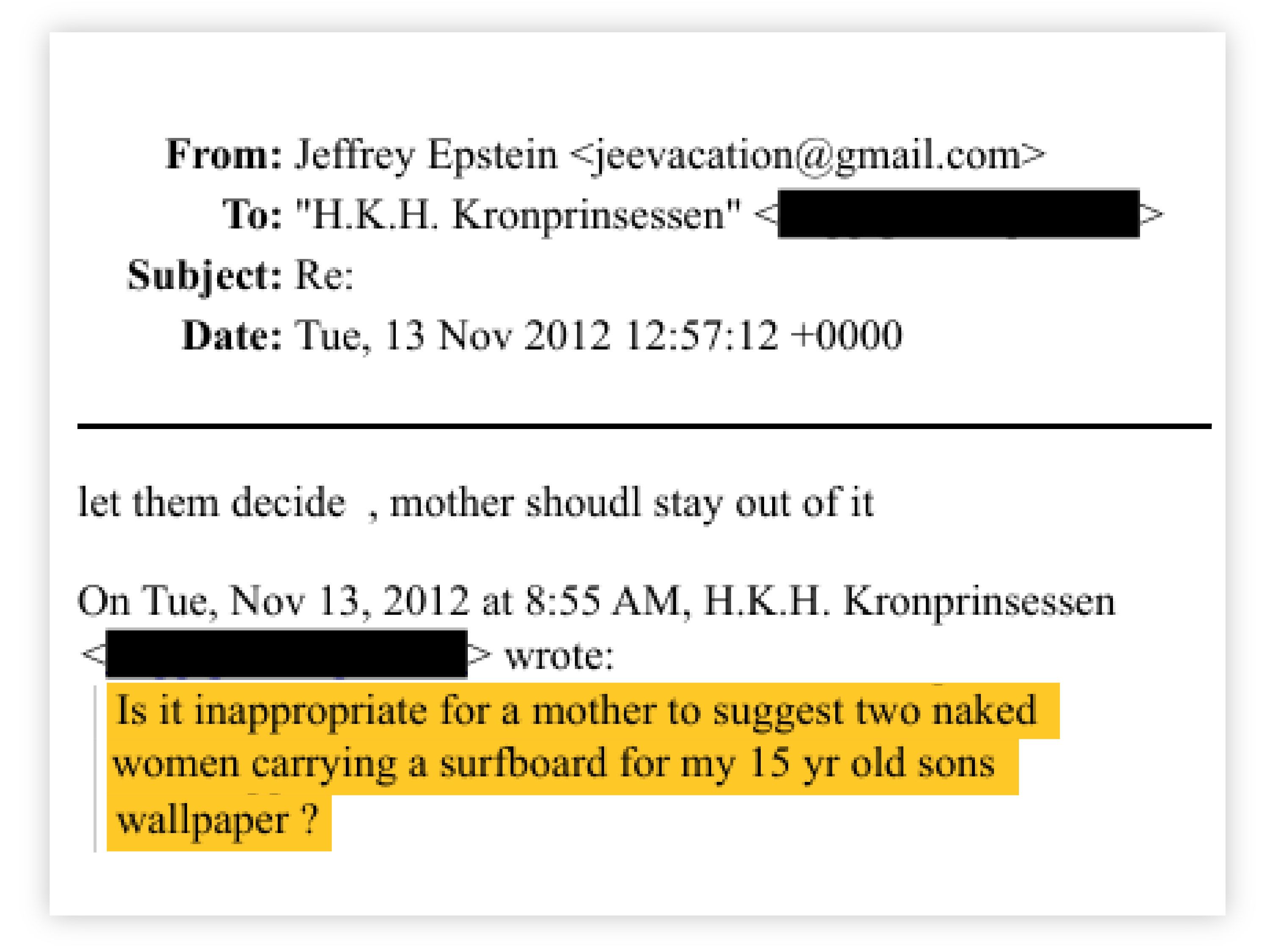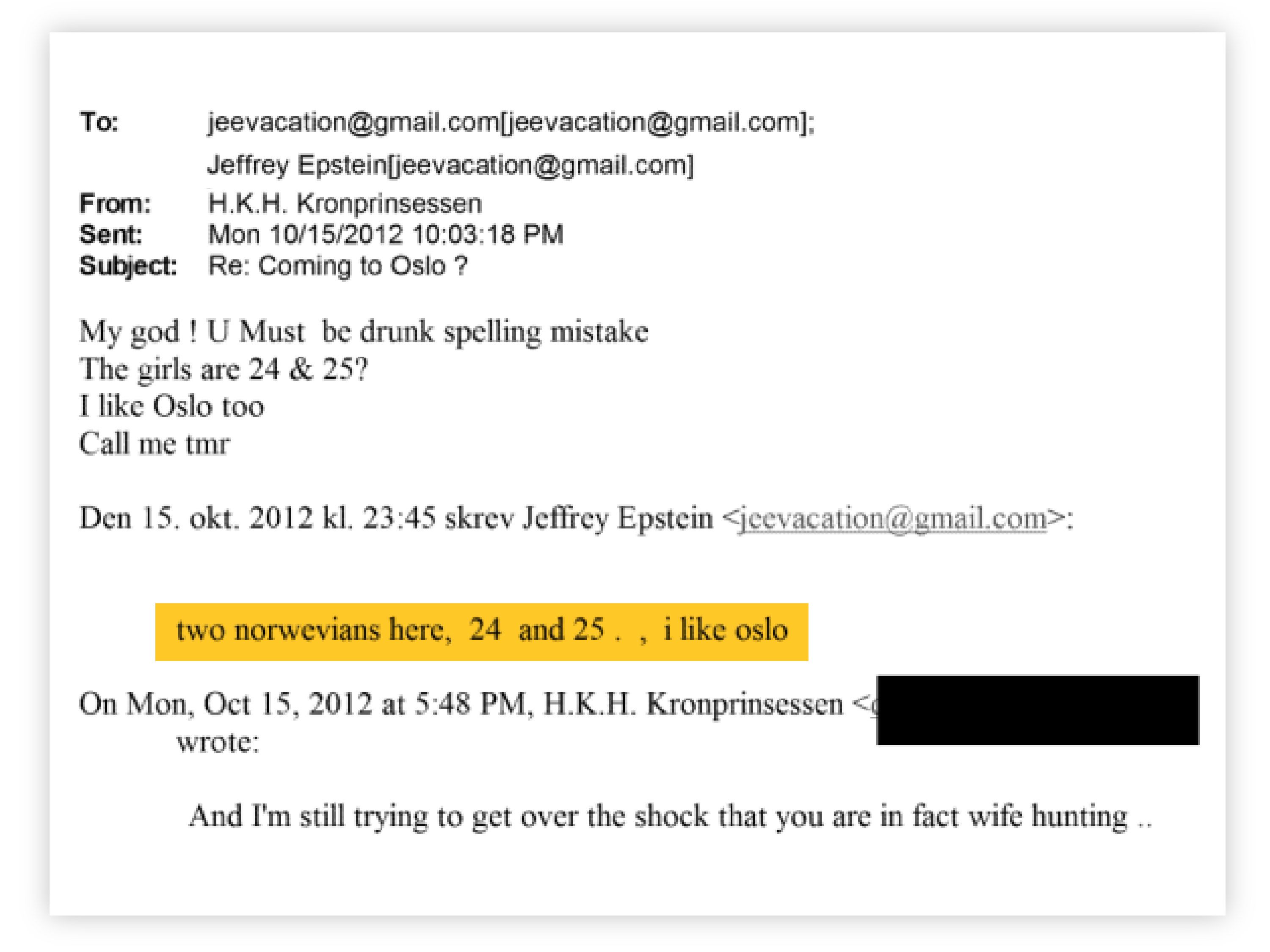 Ook wist Mette-Marit van Epsteins 'voorliefde' voor jongere vrouwen. Epstein mailt haar als hij in Oslo is, met twee vrouwen van 24 en 25.