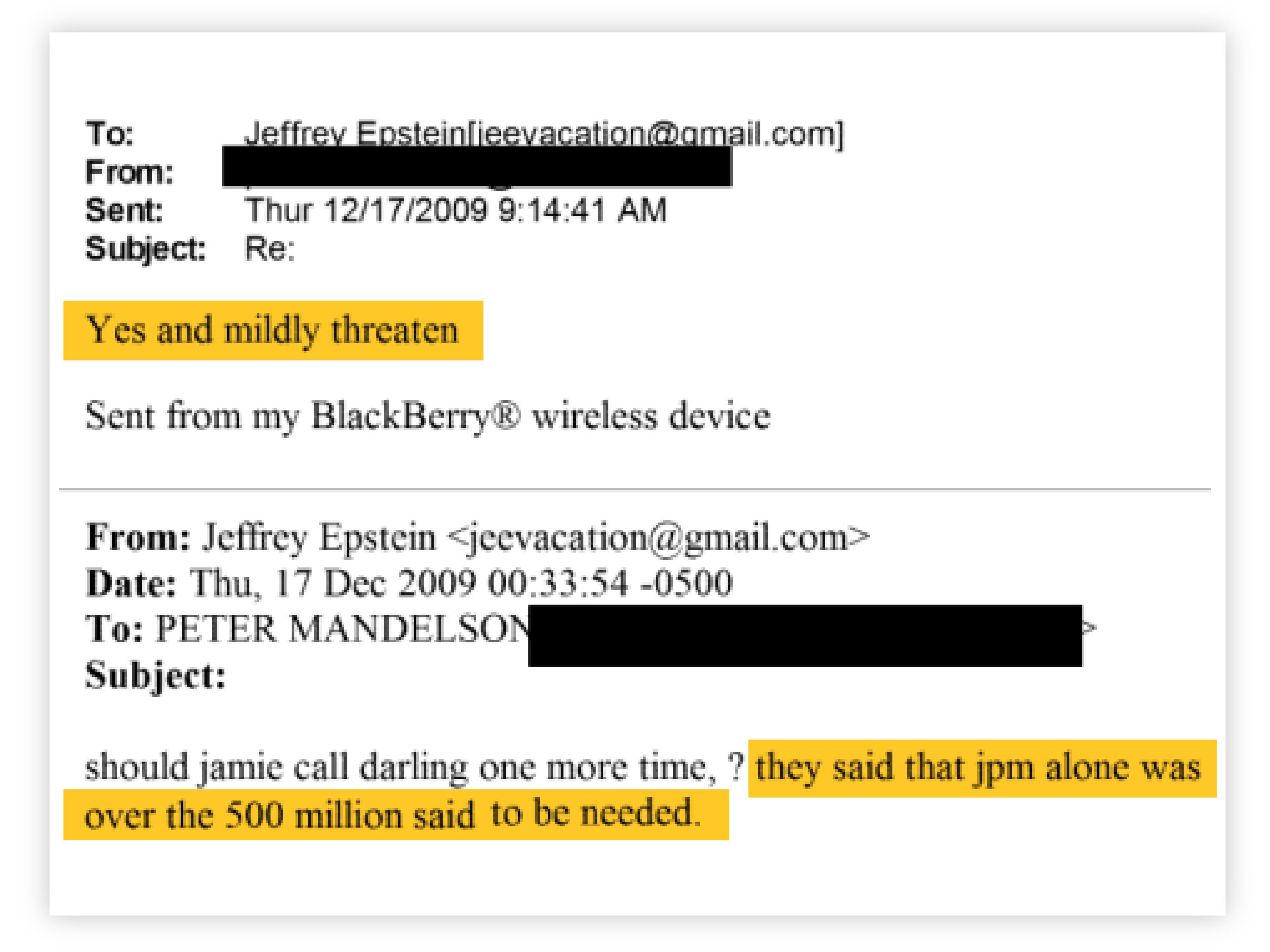 Ook zou hij de Amerikaan vertellen over regeringsplannen om bankiersbonussen extra te belasten. In een mailwisseling zien we dat Epstein zich afvraagt wat ze kunnen doen om dit plan tegen te houden. Mandelson adviseert Epstein om zijn bankiersvrienden bij JP Morgan te vragen de Britse regering "mild te bedreigen". Mandelson - toen minister van Economische Zaken - lijkt zo zijn eigen premier te ondermijnen.